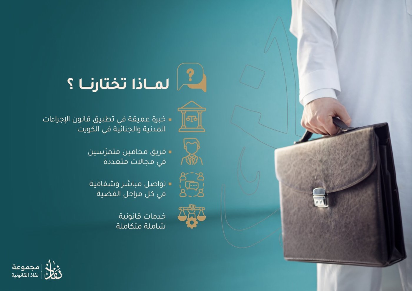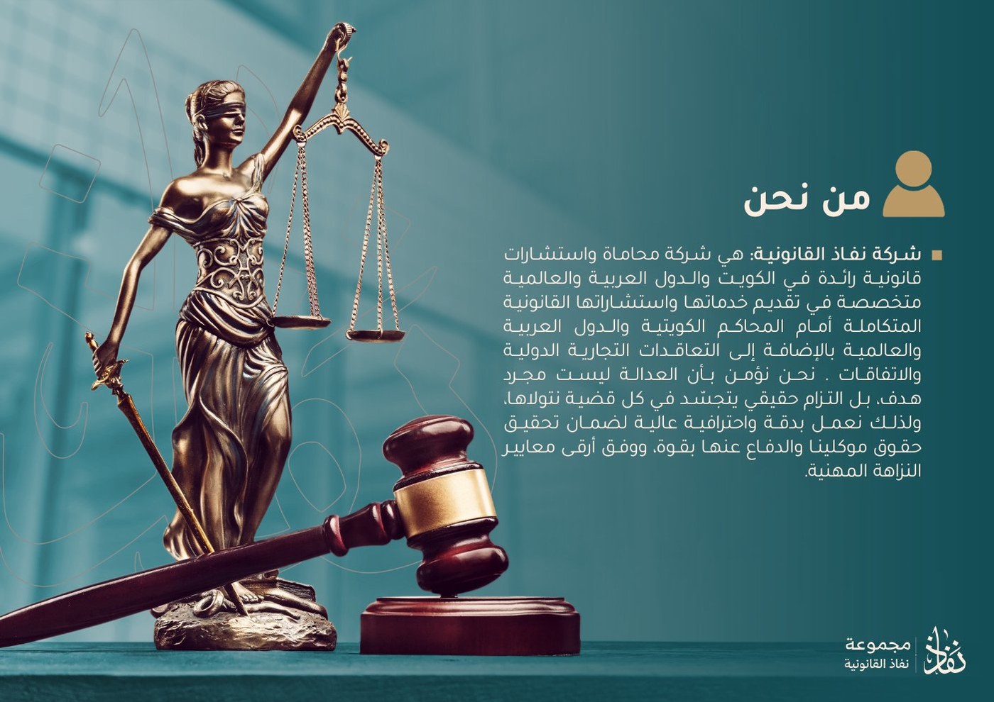 شركة نفاذ القانونية هي شركة محاماة واستشارات قانونية رائدة في الكويت والدول العربية والعالمية، متخصصة في تقديم خدماتها القانونية المتكاملة أمام المحاكم الكويتية والعربية والعالمية بالإضافة إلى التعاقدات التجارية والاتفاقيات.